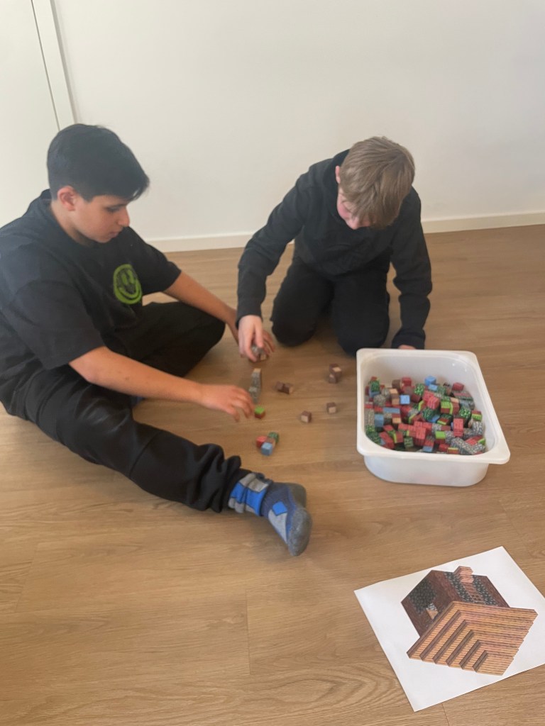 In dieser Phase steht der Transfer vom Digitalen ins Haptische im Mittelpunkt. Die Kinder nehmen ihre ausgedruckten Minecraft-Kreationen als Vorlage und beginnen, diese mit den KidsCraft-Magnetbausteinen nachzubauen.