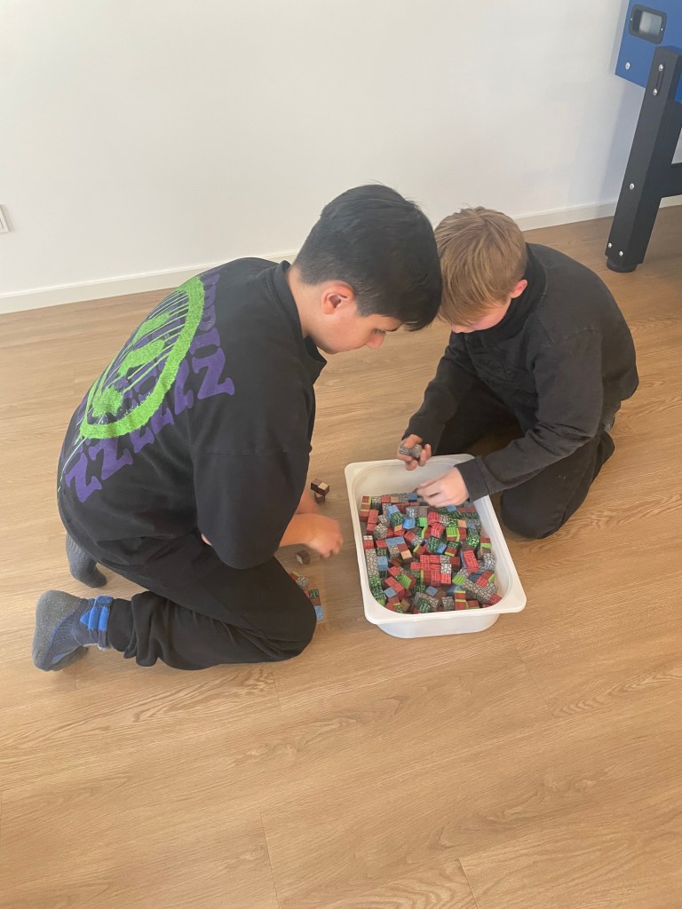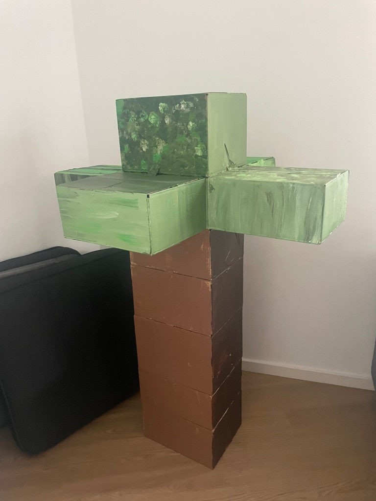 Einige Tage später fingen die Kinder an sich eine andere Form der Umsetzung von Minecraft in die reale Welt zu überlegen. Sie bastelten aus verschiedenen Kartons Blöcke, colorierten diese liebevoll und möchten sich so, nach und nach eine „begehbare Minecraft-Welt“ aufbauen.
